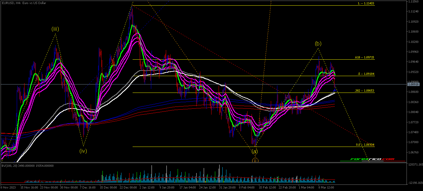 Cenário principal: o preço está finalizando a formação da onda A de grau Minuette, tendo chegado nas proximidades do nível fibonacci de 0.618 em 1.071....Cenário alternativo: essa pode se uma onda 1 bearish se o preço fizer breakout desse nível citado, formando estrutura bearish e dando continuidade a essa tendência alternativa.
